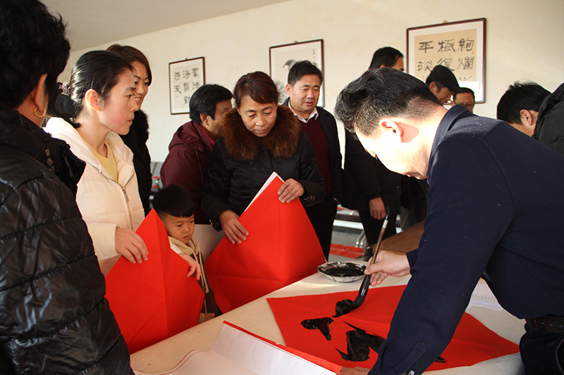 集團(tuán)公司黨委委員、紀(jì)委書記狄彬親自帶領(lǐng)集團(tuán)公司書法志愿者,分別在青鋒農(nóng)場(chǎng)和原二分場(chǎng)大院,進(jìn)行了現(xiàn)場(chǎng)書寫,受到青鋒群眾及公司職工的歡迎。一幅幅喜慶的春聯(lián),一張張熱情的笑臉,伴隨著愉快的笑聲,活動(dòng)現(xiàn)場(chǎng)充滿歡樂(lè)祥和的氣氛。