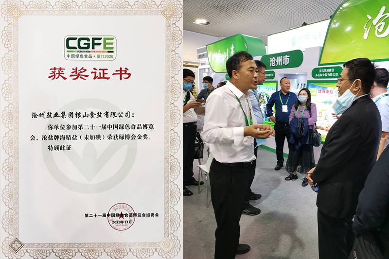 11月4日至11月8日,公司總經(jīng)理張立莊帶隊(duì)赴福建省廈門市參加了第二十一屆中國綠色食品博覽會(huì)。"滄鹽"牌未加碘海晶鹽在眾多參展產(chǎn)品中脫穎而出,獲得本屆博覽會(huì)金獎(jiǎng)。