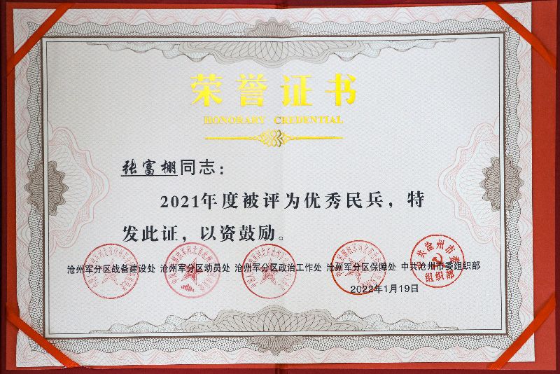 此外,公司武裝部長(zhǎng)張富棚還被滄州軍分區(qū)授予“2021年度優(yōu)秀民兵”稱號(hào)。